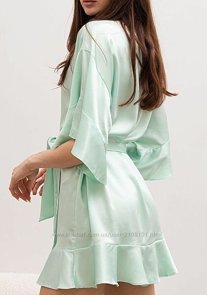 Легкий атласний халат з воланами на рукавах та подолі подарує романтичний настрій та відчуття розкоші.