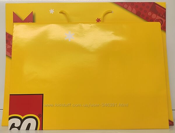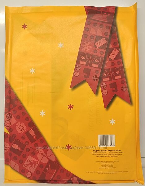 В набор входит: - Подарочный пакет из тонкого ламинированного картона с веревочными ручками. Размер пакета(см): 40 длина х 30 высота х 10 ширина. - Желтая ламинированная упаковочная бумага с логотипом Lego. Размер листа упаковочной бумаги (см): 100 х 140. - Поздравительная открытка, в которой можно написать поздравления и пожелания к празднику. - Конверт для открытки. - Лист с наклейками (на листе 6 наклеек). - Бирка на веревочке. На ней предусмотрены поля «от кого» и «для кого»