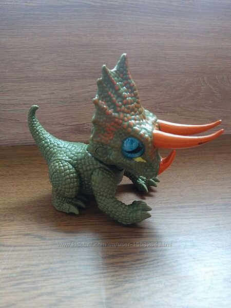 Динозаврик з міцного матеріала, гарно деталізований. Лапки, голівка рухомі. Озвучений, при натискані голови видає звуки та відкриває пащу. Б/у, у відмінному стані. Працює від батареєк (додаються).Розмір: 12 х 14 см.