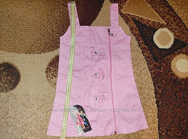 Туника: можно носить как тунику удлиненную либо как футболку до пояса в зависимости от возраста ребенка. Туника сиреневая, на бретельках , на молнии, декорирована бантиками со стразами. Высота от верха бретельки до низа – 56см, ширина 32см.