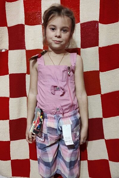 Продам комплект летний - шорты и туника. Новый, с бирками, на девочку.Шорты: можно носить как шорты или как удлиненные шорты-капри в зависимости от возраста ребенка. Карманы, утяжка на поясе, расцветка в клетку, высота от пояса до низа - 41см, объем талии 42см.