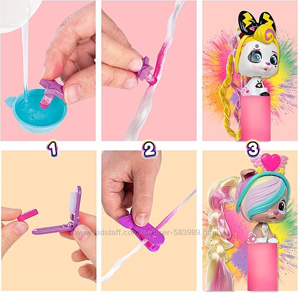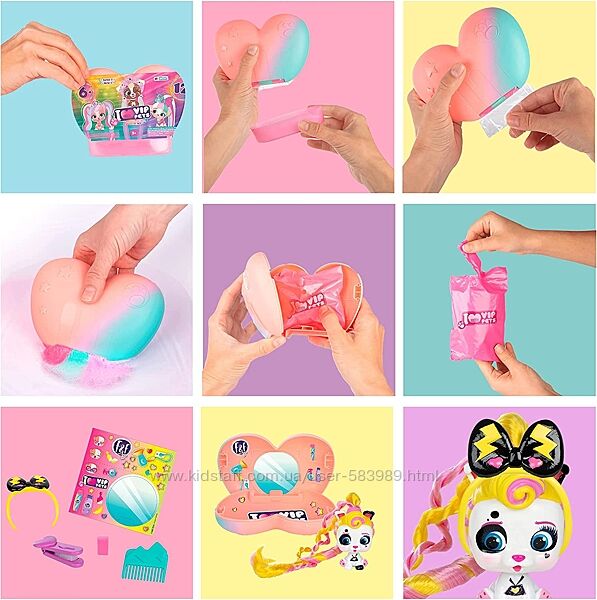 Фігурки розміщені в контейнери у формі серця - в світло-рожевий або яскраво-рожевий. Занурте капсулу у воду, і три смужки кольору на упаковці змиються і розкриють те, що знаходиться всередині. Ви знайдете всередині свого вихованця, три аксесуара, унікальні для цього персонажа, а також гребінець і колекційний лист.