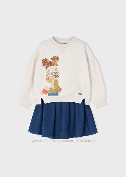 Комплект Mayoral 4980. Теплый комплект для девочки на холодное время года. Очень симпатичный. Состоит из юбки и пуловера. В нем вашей девочке будет комфортно. Модель с длинным рукавом, принтом впереди изделия. На осень-зиму.Характеристики: