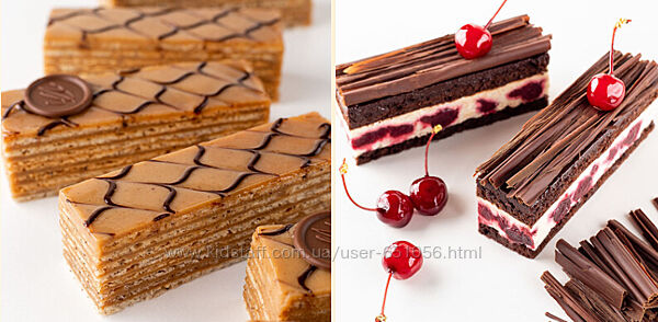 Наполеон шоколадный с вишневой начинкой: песочно-слоеные коржи с какао, крем-намелака на основе темного шоколада, вишневое компоте.