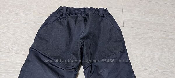 фото 2-6 - Зимние штаны Outventure. Размер указан 122, но они стандартно великомерят. Штаны темно-синего цвета (практически чёрные) с защитными вставками на коленях и попе. Внизу по боках светоотражающие полосы, снегозащита. Пояс с регулировкой ширины (резинка с пуговицей). Есть лямки под пояс (для подтяжек креплений нет).В очень хорошем состоянии, без весомых нюансов. Из моментов только надпись стёрлась вверху, мелкая зацепка на правой штанине внизу, и минимальная потёртости на защитной ткани левого колена внизу (см фото 6 + доп.фото выставлены в разделе "Сообщения для всех" внизу. Если не знать что и где, то вообще можно сказать, что без каких-либо моментов. Колени не потерты). Больше нюансов нет, низ штанин не протерт, попа в полном порядке.