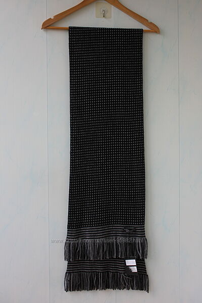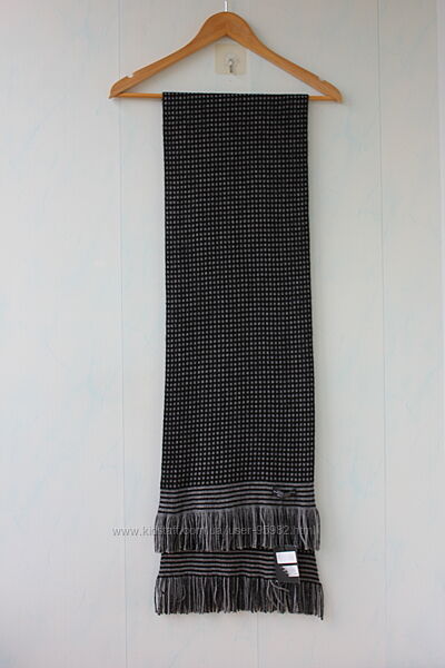 Вовняний, в, язаний шарф nicola,s , вовна 50%. Чудова якість, колір чорний з сірим, не колючий. Унісекс, гарно драпірується.розмір 186 з них по 7 см китиці з кожної сторони, ширина- 28 см.