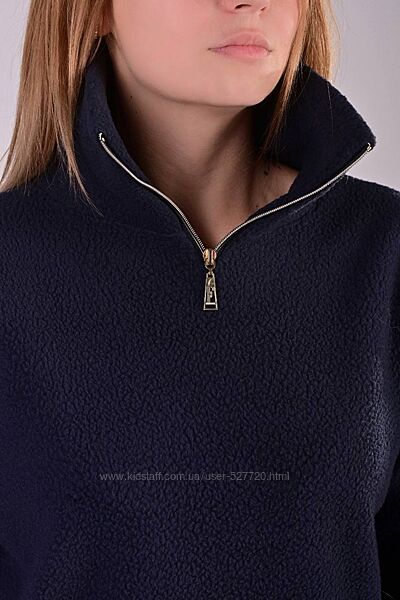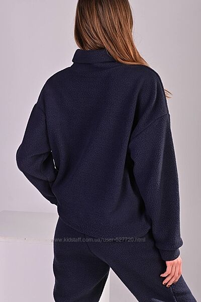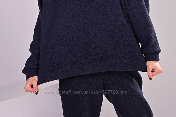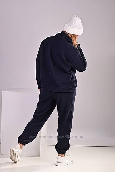 Женский теплый костюм. Кофта свободного кроя с высоким горлом,застегивается сверху молнией. Пояс и низ штанов на резинке.Имеются боковые карманы. Область плеч приспущена.