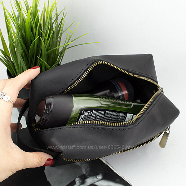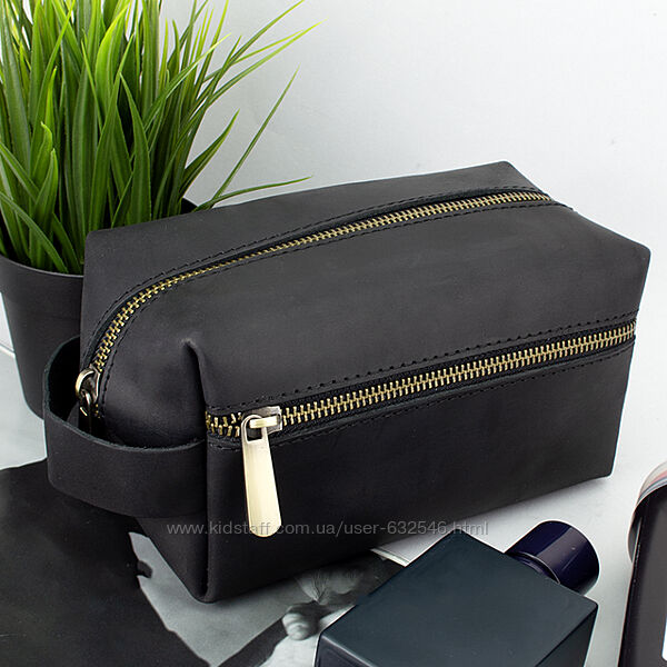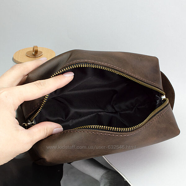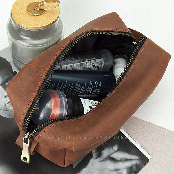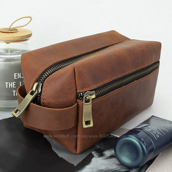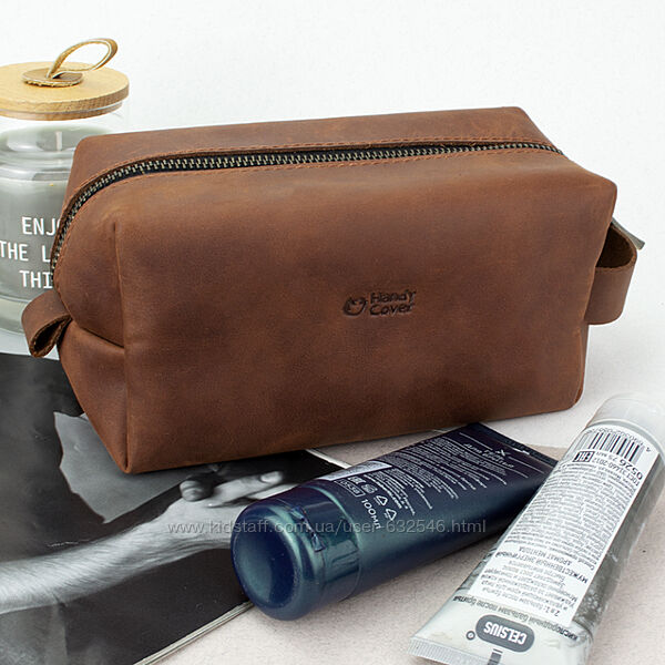 Чоловіча шкіряна косметичка – це незамінний аксесуар для сучасної людини. У такому аксесуарі зручно зберігати та транспортувати особисті засоби гігієни. Ідеально підходить для людей, які цінують комфорт та високу якість. Прекрасно підійде для подарунка людині, що любить подорожувати чи часто у роз´їздах. Несесер досить місткий і має зовнішню зручну ручку. Косметичка зручно складається і не займе багато місця у валізі чи ящику шафи. У косметички одне загальне відділення, яке застібається на блискавку і одна бічна кишеня на блискавці. Шкіряний несесер невеликого розміру, в нього помістяться: тример, зубна паста, щітка, пара тюбиків з кремом. Шкіряна косметичка стане гарним подарунком чоловікові, татові чи другу. На лицьовій стороні витіснено логотип бренду. Блискавки та інша фурнітура – металеві, колір антик. Матеріал - 100% натуральна матова шкіра Crazy Horse світло-коричневого кольору. Вироби з цієї шкіри в процесі використання набувають вінтажності і виглядають дорого і солідно. Неоднорідність кольору, невеликі природні складки, шрами тварини не вважаються браком. Підкладка – щільний текстиль чорного кольору. Розмір: довжина 18 см, висота 9 см, ширина основи 9 см. Виробництво – Україна. Продається у фірмовій коробці в еко-стилі. Ця модель є також у темно-коричневому кольорі.