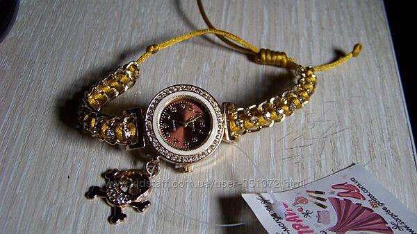 Есть видеообзор! Видео на ютубе *****************************Часы в роковом стиле, в золотых тонах, диаметр закаленного стекла 2.6 см, циферблат по кругу украшен мелкими кристаллами хрусталя. Браслет выполнен из золотой цепи с продетым через нее текстильным шнуром, браслет украшен стразами и подвеской-череп, кварцевый механизм, стальной корпус. Новые, без дефектов!