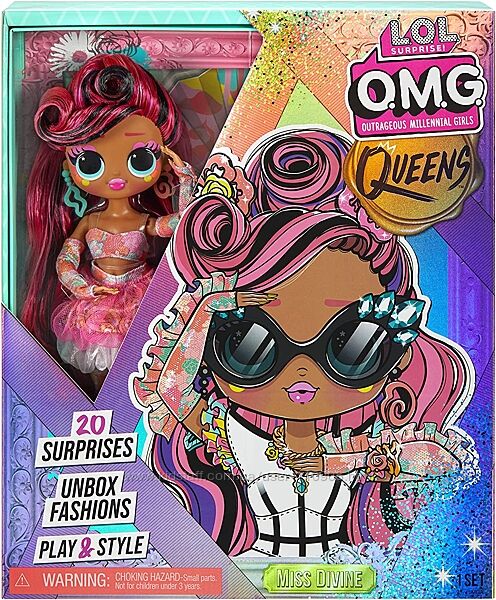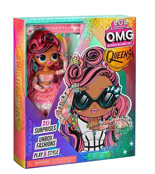 В коробке 20 сюрпризов, включая LOL Surprise OMG Queens модную куклу Miss Divine, модные вещи и аксессуары.