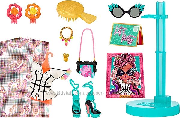 В наборе: 1 кукла LOL Surprise OMG Queens, модные вещи, обувь, аксессуары, щетка для волос, сумка для одежды, приглашение, вешалка и подставка для куклы.