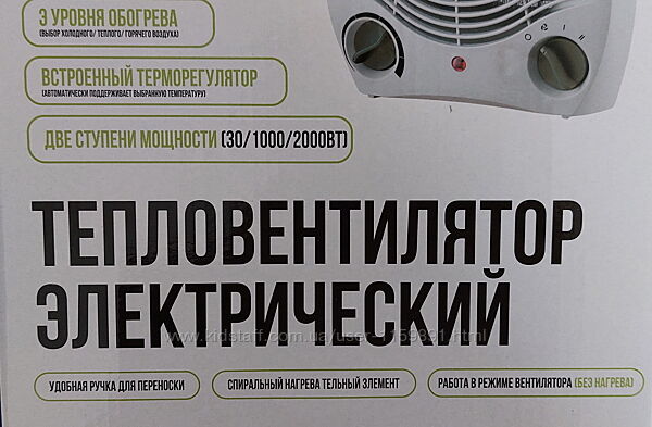 3 режима работы:просто вентилятор (без нагрева), обогрев с мощностью 1000 Вт и 2000 Вт;