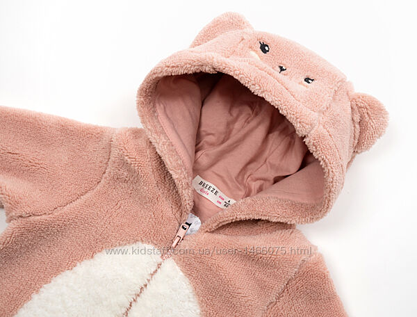 - Комбінезон приємного кольору запорошеної троянди, з кремовою вставкою на животику, довгими рукавами, і не з´ємним капюшоном, з вишитою мордочкою і маленькими вушками.