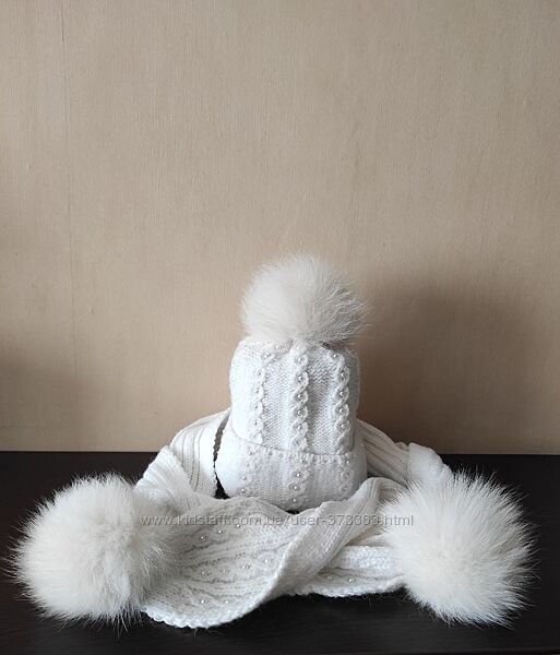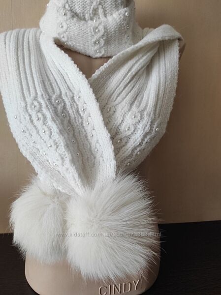 Набор (шапка + шарф), белого цвета. Внутри шапки, вокруг головы утеплено полоской флиса 8 см. Объём - 56/60 см. Длина шапки 30 см, из них подворот - 10 см. Балабон около 15 см. Мех густой - натуральный песец.