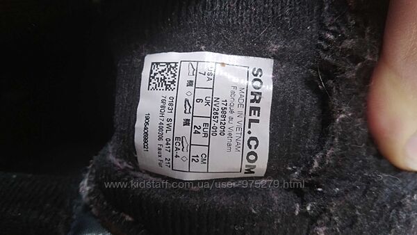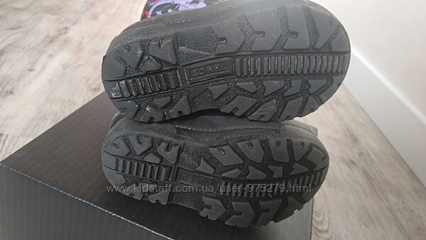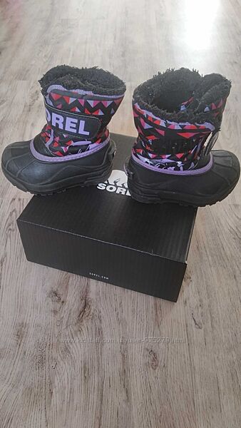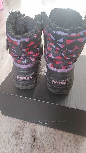 Зимние сапожки Sorel. В самые сильные морозы ножки дочи были сухие и теплые. Очень довольны ими. Подходят не только для снега, но и для слякоти. Подошва не скользит, липучки держат очень хорошо.После одного ребенка. Носили один сезон. Оригинал - заказывались на Амазоне.