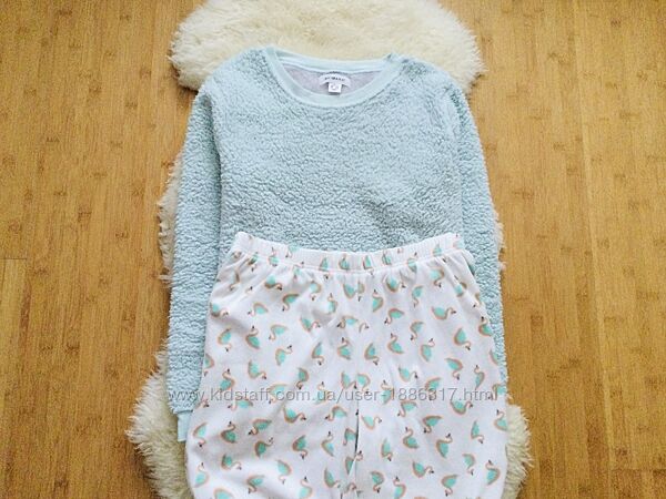 Primark Флисовая Пижама. Лебеди M-L зимний Домашний комплект. пушистый флисовый реглан- меховушка "Тедди" нежно- бирюзового цвета на манжетах и флисовые штаники с принтом Лебедей. состояние идеальное Длина 67; подмышки 53; рукав от ворота 71. Длина 97; шаговый 74;Другие объявления продавца