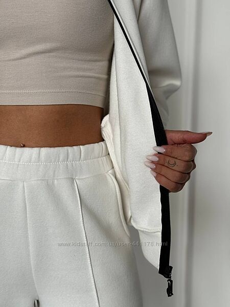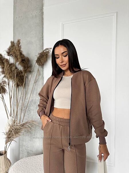 Базовий, теплий костюм. Кофта на змійці з карманами. Манжети, ворот та низ виробу оздоблені трикотажною рібаною. Штани високої посадки, з карманами.