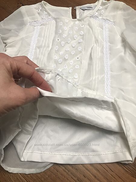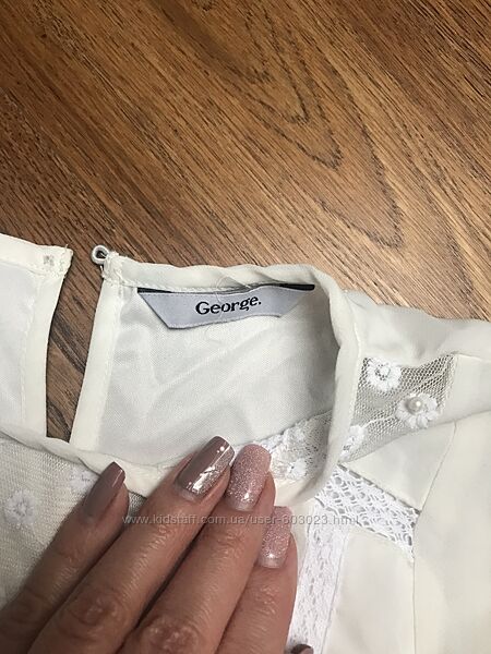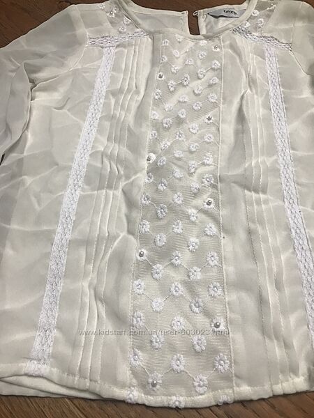 Святкова шифонова блузка George на 5-6 р, зріст 110-116 см. Верх - шифон, поєднання двох видів кружева, перлинки, знизу є підкладка. Заміри: довжина блузки 40 см довжина рукава 40 см ширина плечей 27 см ширина під руками 31 см.