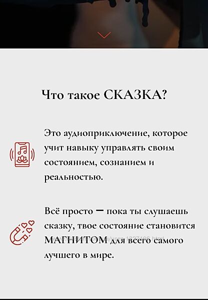 Главное, что это работает и вы получаете желаемое ― чистое белье и личный транспорт.Слушаешь сказку и у тебя меняется состояние. Мы это называем состояние МАГНИТТы становишься МАГНИТОМ для всего самого лучшего в этом мире:Магнитом для денегМагнитом для людейМагнитом для красоты и здоровья…