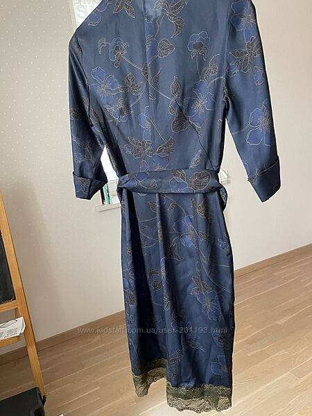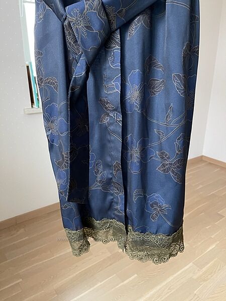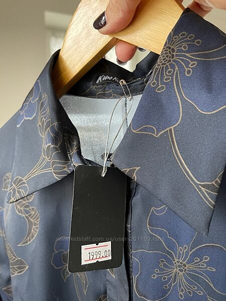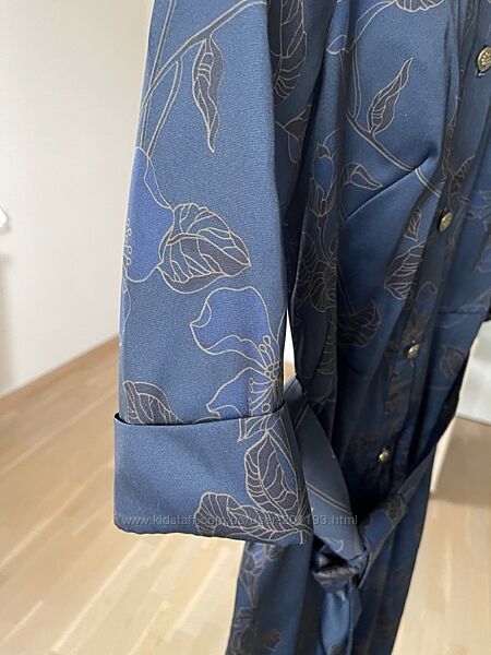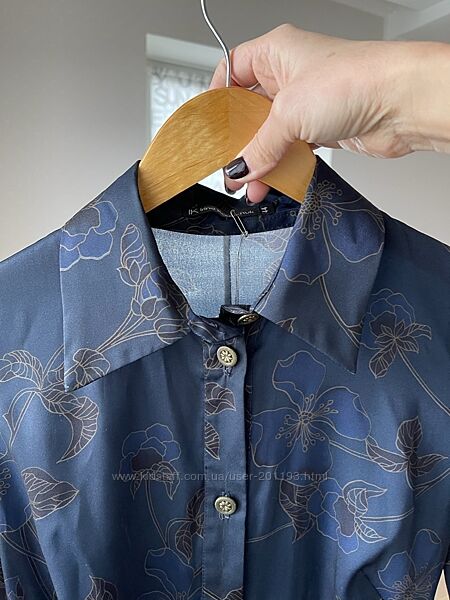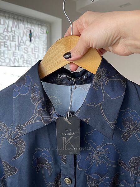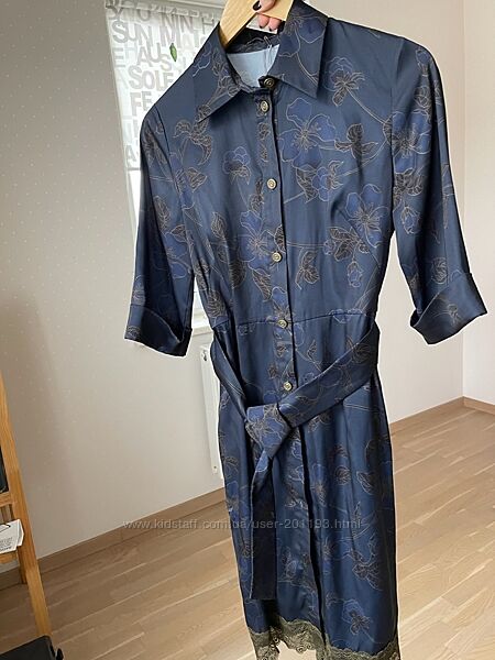Стильна елегантна сукня-сорочка на ґудзиках, під пояс. Тканина синя, атласна, в квіти. По низу пришито мереживо.Колекція IRINA Kovalchuk.