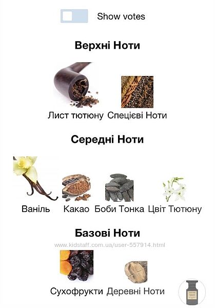 Густий, довготривалий, стійкий та шлейфовий. Шанувальникам Том Форда сподобаються ноти ванілі та тютюну. Вони тут дуже органічно поєднані. Надзвичайно збалансовані всі компоненти. Ваніль відчувається стручкова, справжня, ніякої хімозності. Дорогий тютюн. Плюс спеції, гвоздика явно домінує. Не змивається, тримається до останнього))