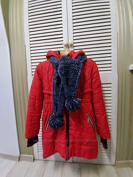 Подробное описание: Пальто зимние с шапкой и шарфом, красное и синее, р.134-150