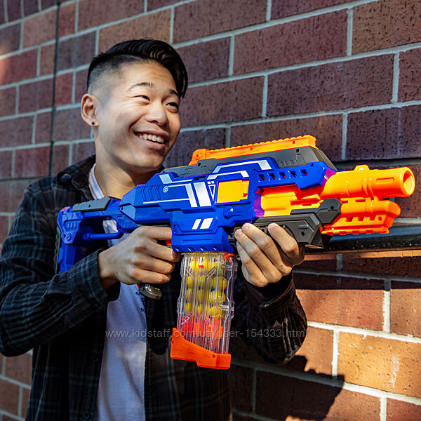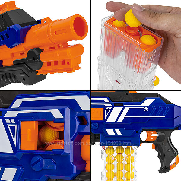 - 25 пенопластовых шариков вылетают из разноцветного оружия на сверхбыстрой скорости и с малой отдачей.