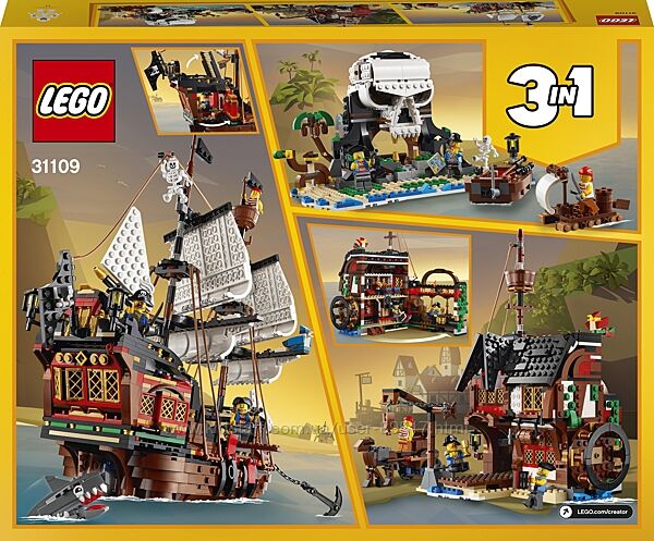 Lego Creator Піратський корабель 31109Рррррр! Підійми вітрила цього фантастичного Піратського корабля і знімайся з якоря! Шукай нові скарби: трюм майже спорожнів. Агаааа, ліворуч за курсом корабель! Викочуй гармати і приготуйся стріляти. Здається, на цьому кораблі є чим поживитися! Коли ця пригода закінчиться, перебудуй корабель у Піратський готель або таємничий Острів Черепа. У цьому наборі 3 у 1 ніколи не буває повного штилю!