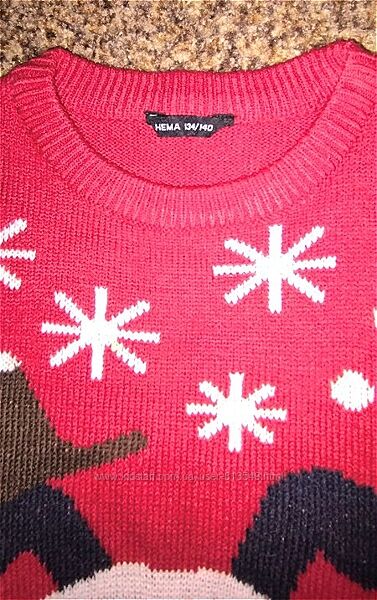Красивый новогодний свитер с рисунком весёлый снеговик. на 9-10(р.134-140) HemaЦвет-красный. Машинная вязка.