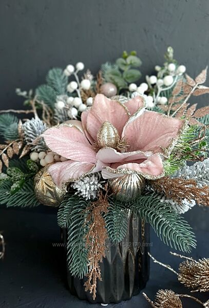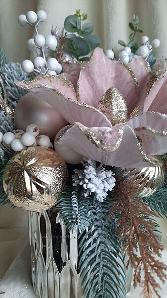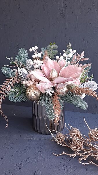 Элегантная сезоннаякомпозицияиз елочныхшаров, блестящих добавок, пудровой магнолии и заснеженныхветочек, расположенными в серебристом керамическом кашпо.Идеальноедополнение к рождественским украшениям в вашем доме илиофисе. Композицияэффектная и очень атмосферная.