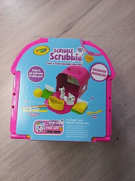 Цей набір для ігор на задньому дворі включає 2 домашніх тварин Scribble Scrubbie, 1 ванну, 1 щітку для чищення, 3 маркери, що миються, і 1 будиночок (бунгало) для домашніх тварин, який також служить предметом для зберігання. Цей набір стане чудовим подарунком для дівчинки та хлопчика!