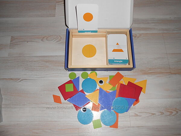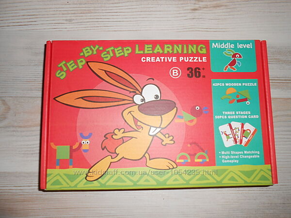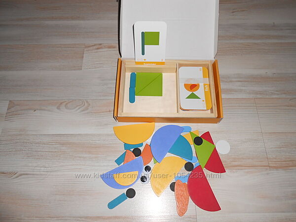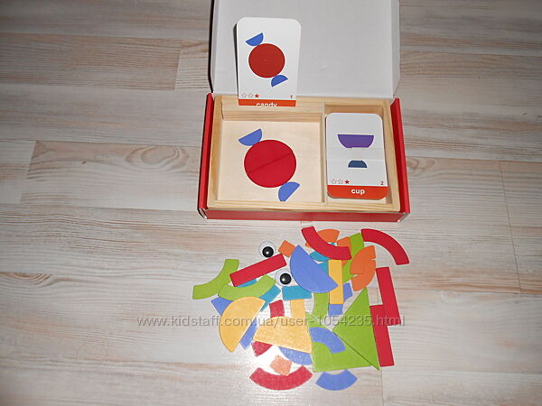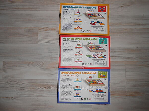 В наборах деревянная основа (сбоку есть отделение для карточек,также есть основное поле для сборки фигур и выемка, куда вставляется карточка, чтобы на нее смотреть и складывать по образцу). Цель игры: выбрать карточку с заданием и сложить из разных фигур нужную картинку. Возрастная категория 3+. Цена любого наборчика: 400 грн.