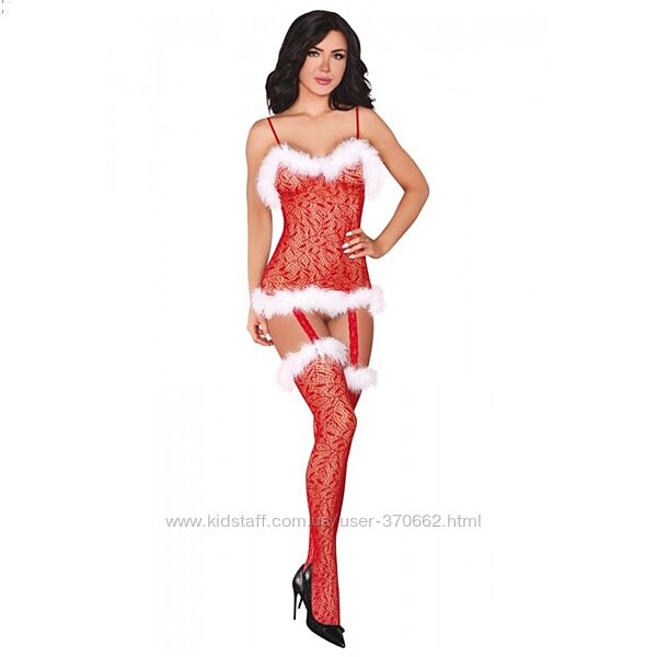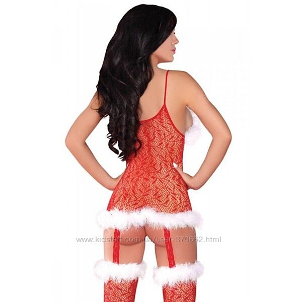 Ефектний боді-комбінезон, нероз´ємно пов´язаний мереживними ремінцями з панчохами в різдвяному варіанті.Ніжна червона тканина з квітковими мотивами оздоблена білим пухом.