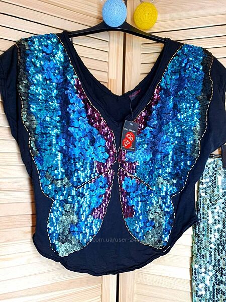 Комплект с яркой и красивой вышивкой паетками .Футболка оверсайз , рукав летучая мышь , спереди бабочка паетками и бисером .