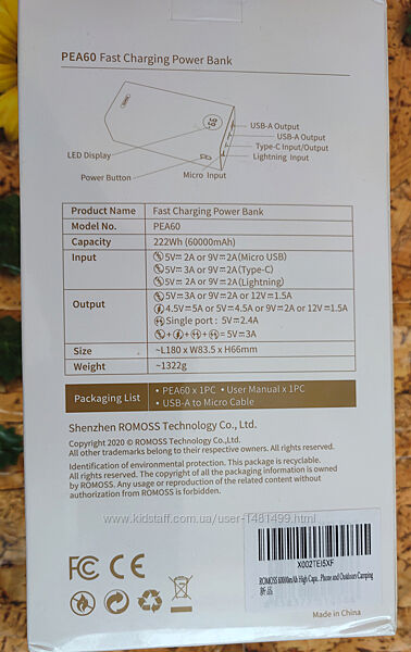 Подробное описание: ROMOSS PEA60 Повербанк 60000 mAh Быстрая зарядка 3.0 Quick Charge