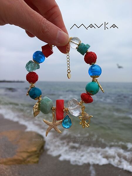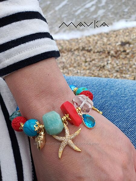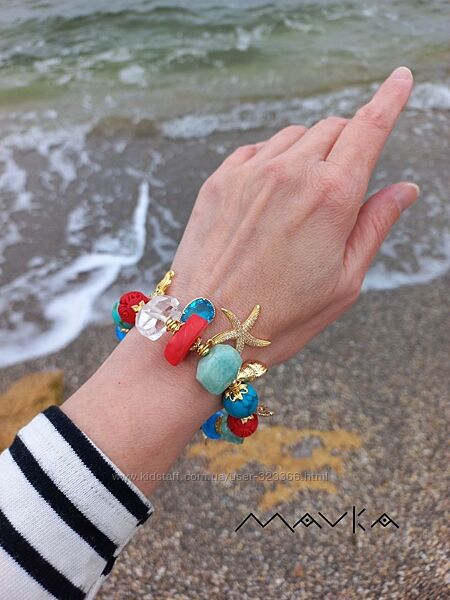 Браслет "Кораловий риф"Намистини Мурано, корал, амазоніт, гірський кришталь, намистини зі смоли, бірюза, кварц, преміальна фурнітура інкрустована фіанітами.