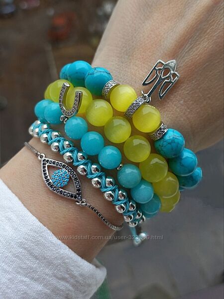 Патріотичний сет з 5 браслетівБірюза, котяче око, кварц, гематит, вощений шнур, преміальна фурнітура інкрустована фіанітами.
