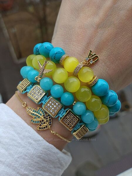 Патріотичний сет з 5 браслетівБірюза, котяче око, кварц, вощений шнур, преміальна фурнітура інкрустована фіанітами.