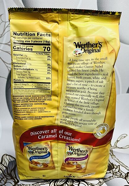 Оригінальні карамельні цукерки Werthers виготовлені з натуральної олії та свіжих вершків. Кожна цукерки упакована індивідуально, що робить їх ідеальними, щоб поділитися з друзями та сім´єю.