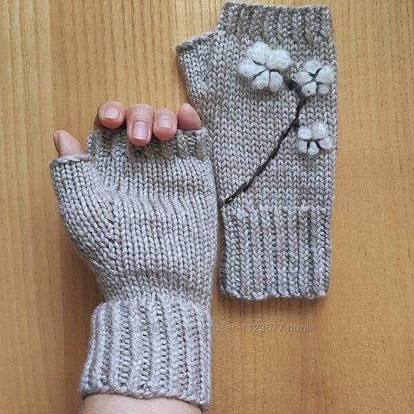 Мітенки виконані з італійського мериносу Ірен, до нього додала ниточку кашеміру в тон. І вишила гілочку бавовни.