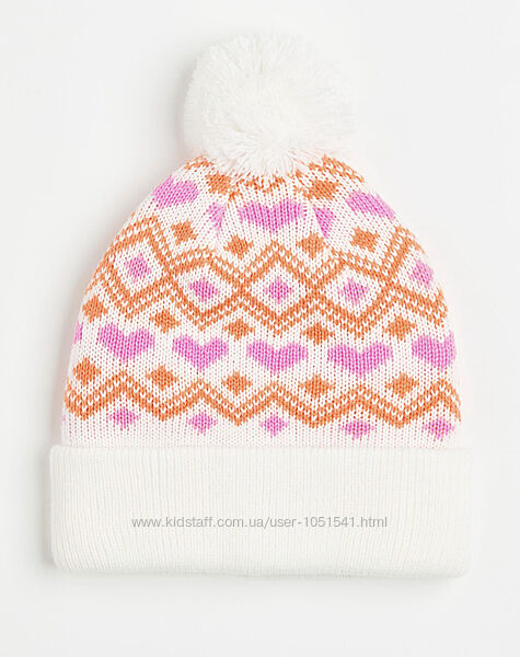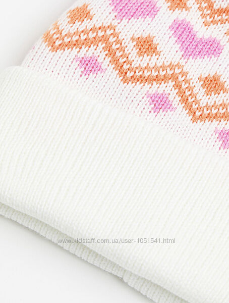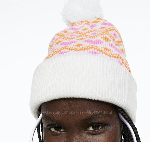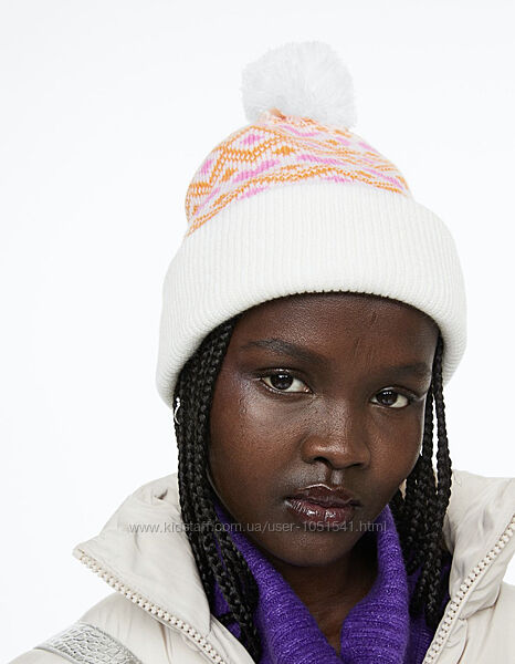 Теплий зимовий комплект шапка і варежки від H&M модель зима( еврозима)- подвійна вязка( без фліса) ,колір - білий з яскравим візерунком .РІСТ 170+ ( на 14+ рокі висота-23 об,єм-22 см , варежки 22 см)
