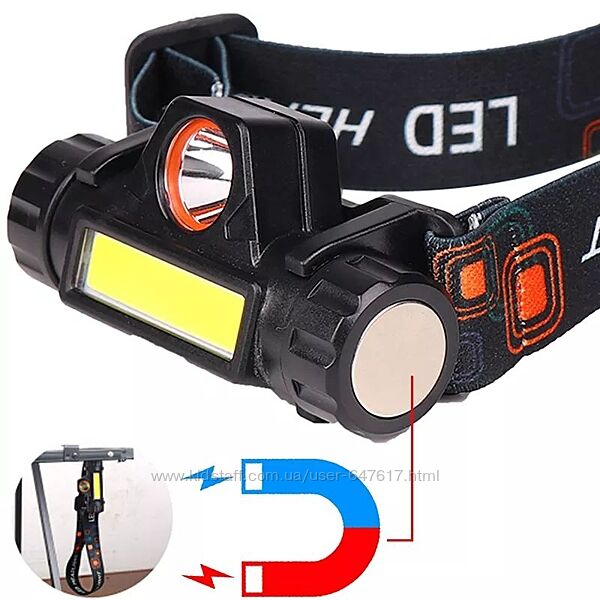 Аккумуляторный налобный фонарь Xpe+cob с магнитомИсточником света в данной модели является твердотельные светоизлучающие диод