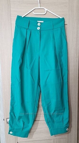 Широкие брюки бананы высокой посадки из однотонного хлопкового коттона демисезонные. Бренд- Garne Складки на талии спереди, фигурные вытачки сзади и широкие манжеты по низу брючин создают объем и позволяют изделию идеально сесть по фигуре. Пояс широкий на пуговицах, на нем предусмотрены петли для ремня. Материал: коттон - нейлон. Состав: 55% хлопок, 40% полиэстер, 5% эластан Растяжимость: низкая (до 2 см). ---- Размер: XL-XXL -Ширина ПО линии талии 41,5 см, -Длина изделия по внутреннему шву 69 см, -Длина изделия по внешнему шву 103 см ---- Доставка : Новая Почта Предоплата 100% Без торга, обмена, возврата.