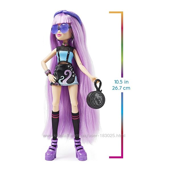 Познайомтеся із фінлі: гламурною дівчиною гурту. Ця модна лялька відрізняється чудовим знімним хвостом русалки з блискучими мереживами та рюшами, блискучим золотим верхом, розпущеним волоссям з пурпуровими відблисками та шістьма аксесуарами для ляльок, включаючи