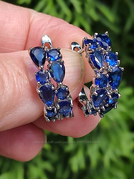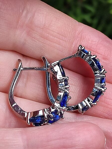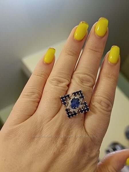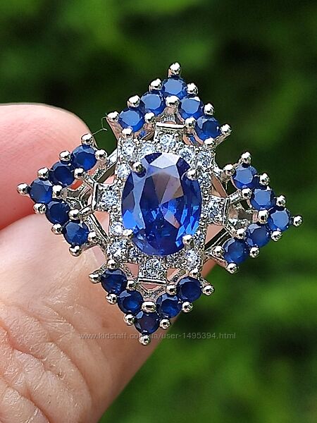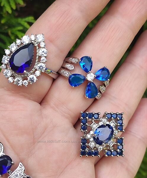 Очень красивое ,правильним ромбом- кольцо,безразмерное, с синими и белыми фианитами,есть под него серьги и браслеты.