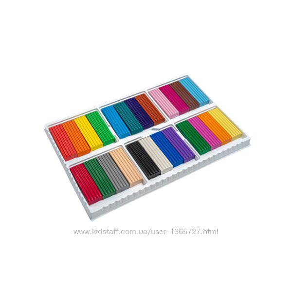 упаковка: коробка-рукав з щільного ламінованого картону, пластикова підложка з комірками для брусків пластиліну всередині