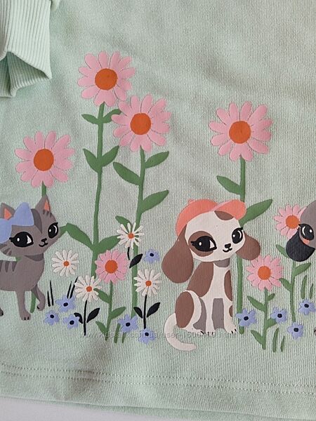 Туніка пошита трохи оверсайз, пряма; рукавички пишні на манжетах, малюнок прогумування. колір приємна м´ята. Склад тканини: 56% бавовна, 44% поліестр, у тканині не відчувається, додано для міцності і щоб не скручувалася.