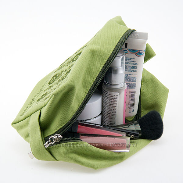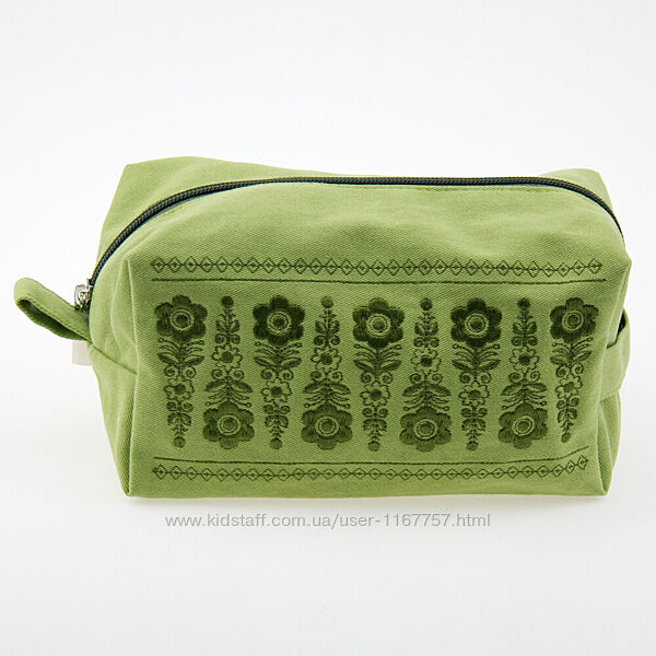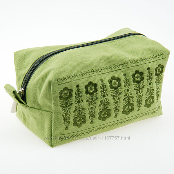Вишита косметичка №962 виготовлена із зеленого котону. Передня частина декорована вишивкою в тон виробу.Косметичка прямокутної форми розміром 19 х 10 х 10см. Застібка – на блискавку. Підкладка виконана із бавовни.