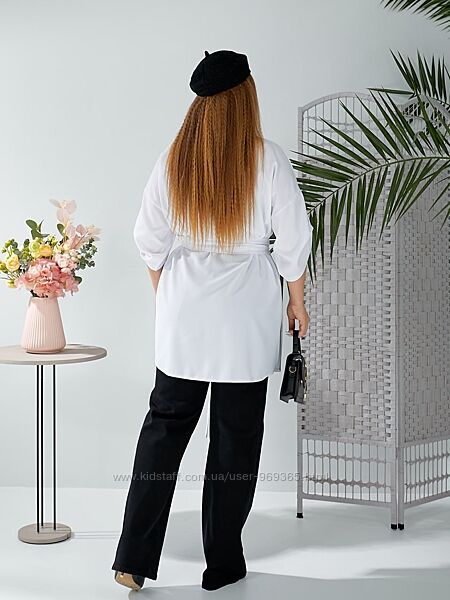Стильна блуза із софту ( тканина не тягнеться). Силует прямий, вільний, подовжений. Комір стояче-відкладений. Блуза застібається на гудзики по передній планці. Лінія плеча спущена, рукави довжиною трохи нижче ліктя, можна вкорочувати за допомогою спеціальної деталі на гудзику. Низ блузи оформлений розрізами з боків. Пояс із основної тканини в комплекті.