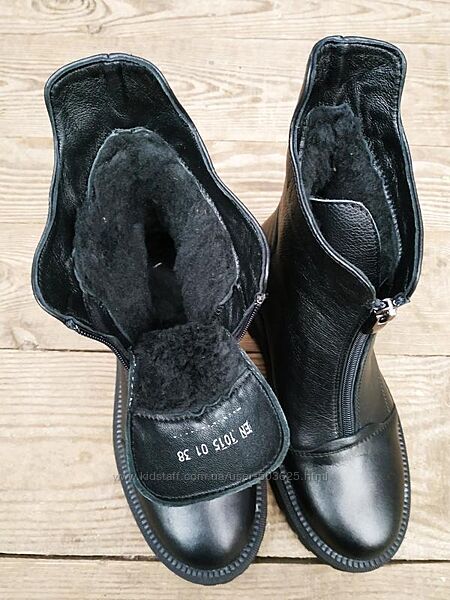 Подробное описание: Зимові жіночі шкіряні чорні черевики на низькому ходу, спереду замок, натур